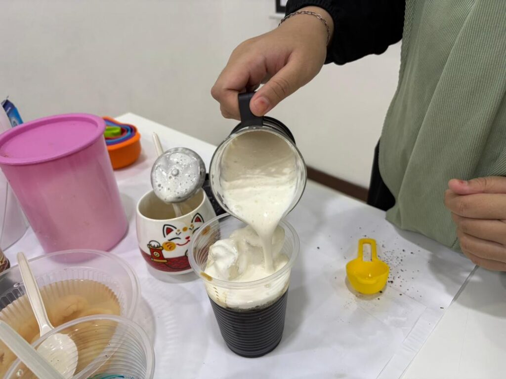 Sesi pembelajaran minggu ketiga dilaksanakan secara hands-on sambil kelas berlangsung, di mana peserta bukan sahaja menerima penerangan teori malah terus terlibat dalam penyediaan minuman.