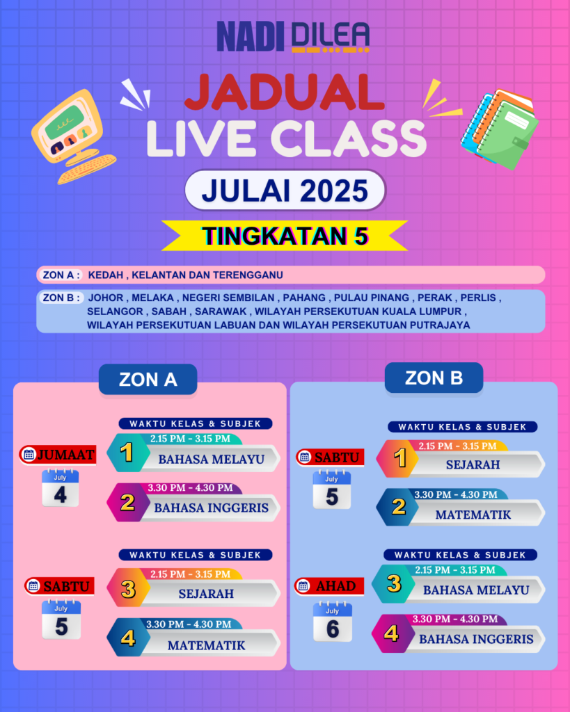 Untuk perhatian semua pelajar Tingkatan 4 & 5 Zon B. Kelas secara dalam talian (LIVE) akan dijalankan mengikut ketetapan berikut: